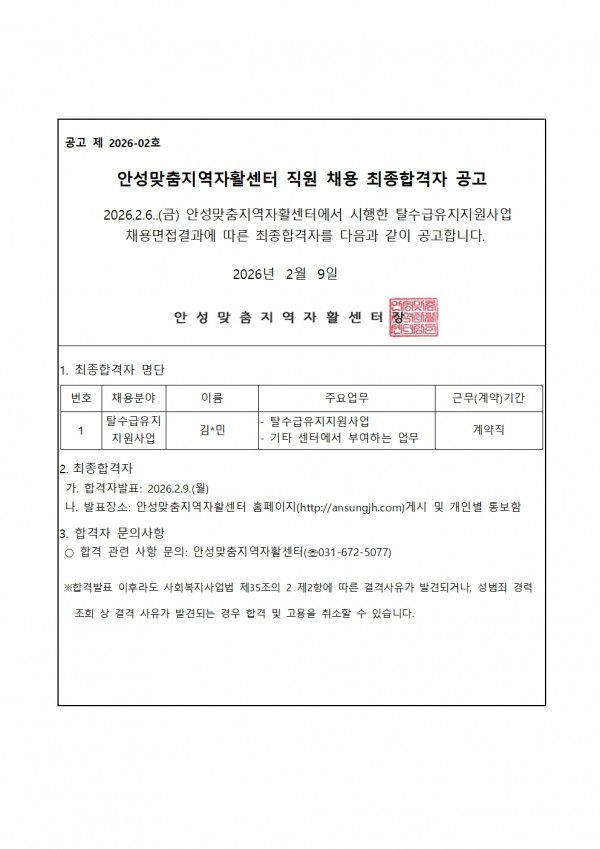 2026년 1차 직원채용 최종합격자 공고 > 공지사항
