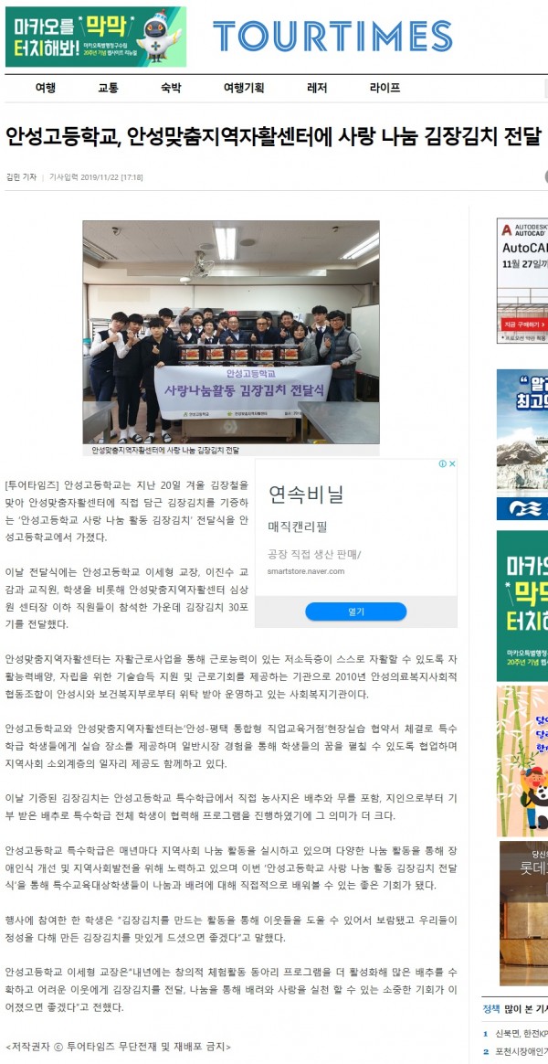 안성고등학교, 안성맞춤지역자활센터에 사랑 나눔 김장김치 전달_투어타임즈 페이지 정보 작성자 안성맞춤 작성일20-01-14 11:33 조회5,259회 댓글0건 이전글 다음글 목록 본문 이전글 다음글 목록